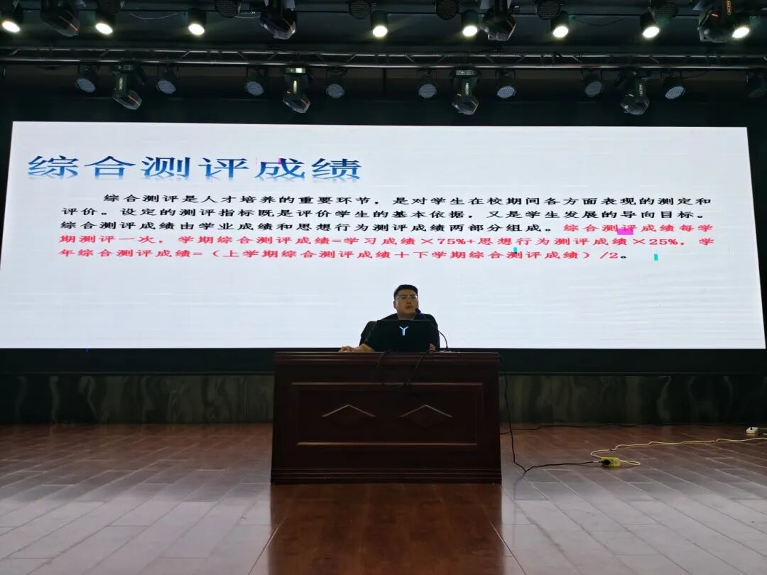 随后,老师详细介绍了思想测评与综合测评成绩的评定标准,帮助新生清晰了解大学评价体系。会议还重点强调“德智体美劳全面发展”的培养理念,鼓励新生积极参与各类实践活动,提升综合素养。
